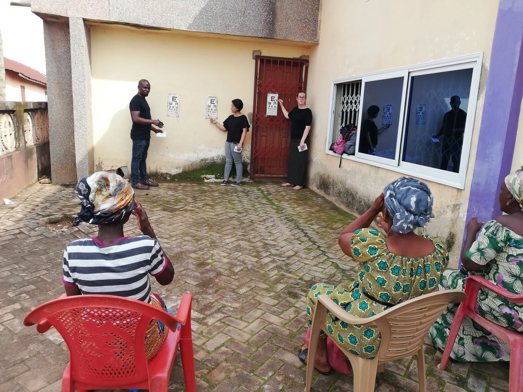 In Ghana, approximately 17% of outreach patients have presbyopia and need reading glasses, while approximately 9% have refractive error and need prescription glasses. Those with refractive error receive new prescription glasses. Approximately 7% of outreach patients have conjunctivitis or other eye infections, and they receive eye medication. Unite For Sight volunteers assist with dispensing the glasses and medication.